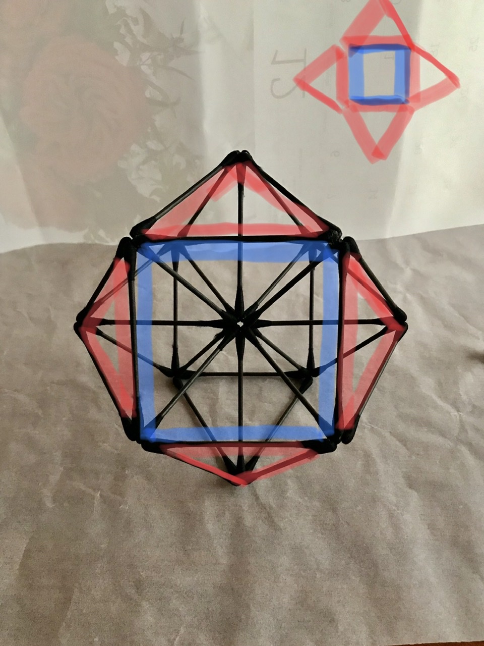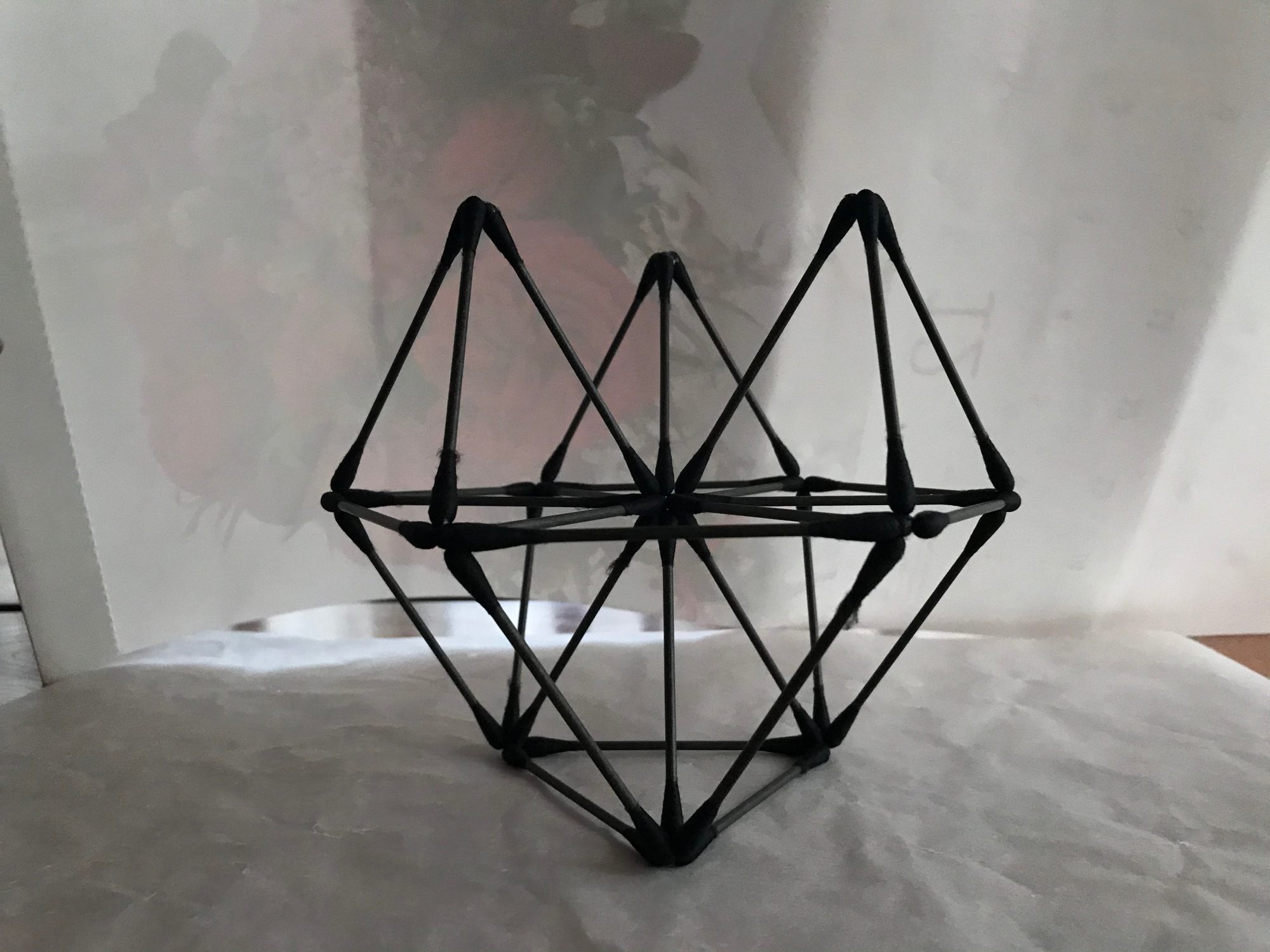 ②6つできた三角のうち、一つおきに3つの三角の上に三角錐を立てます。