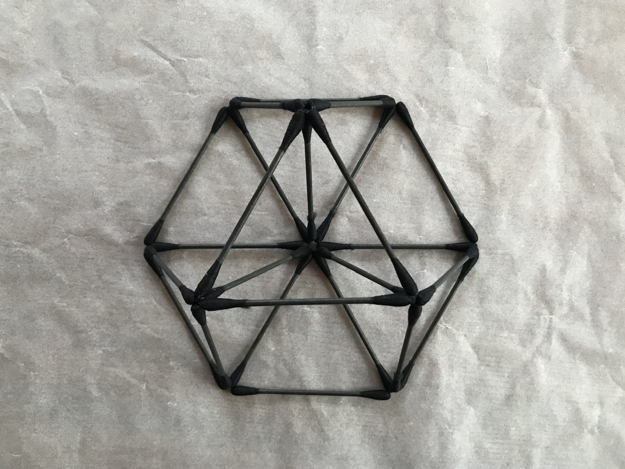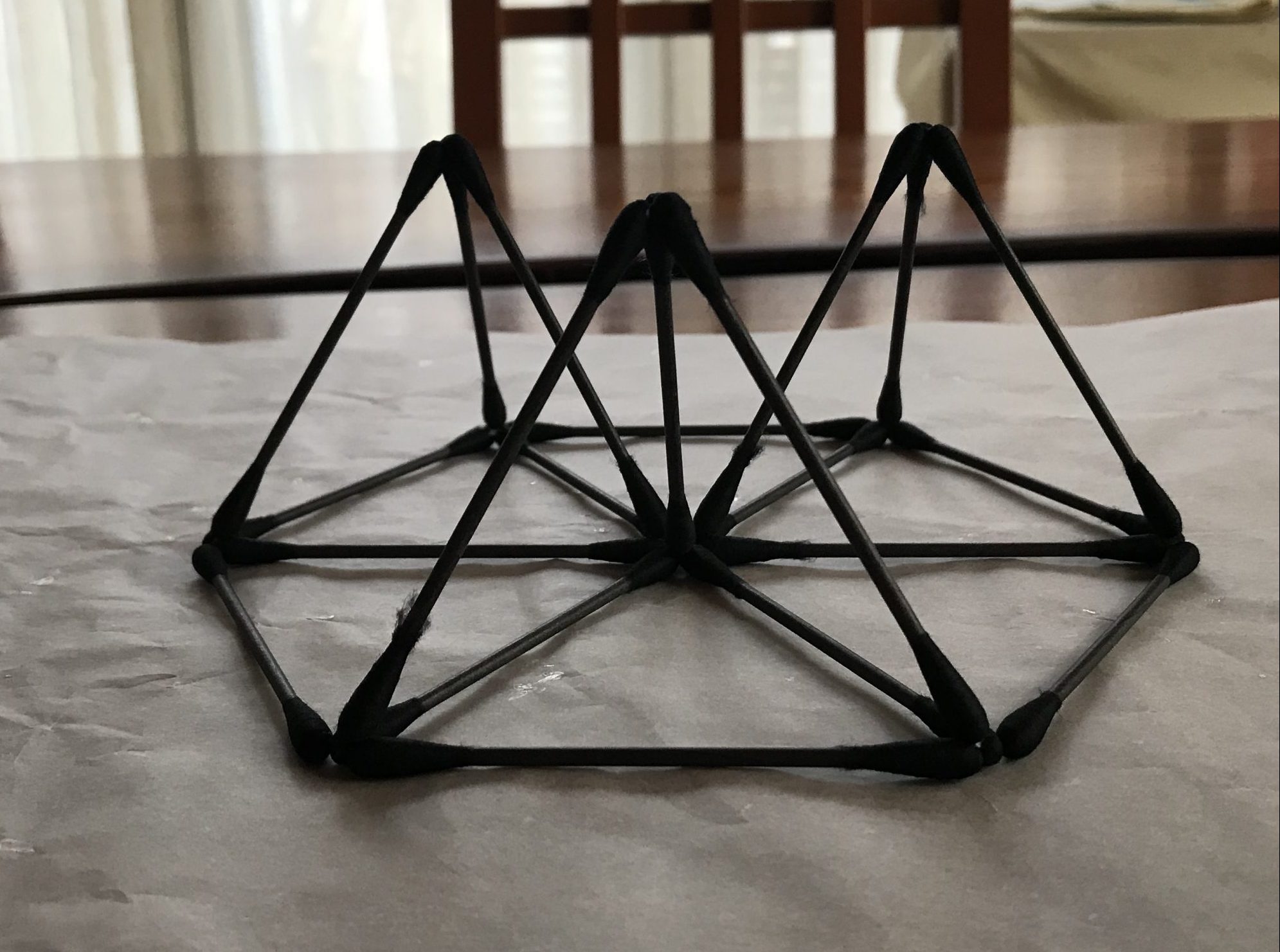 ③ ②で作った三角錐の頂点に綿棒を渡す。上から見ると三角形。