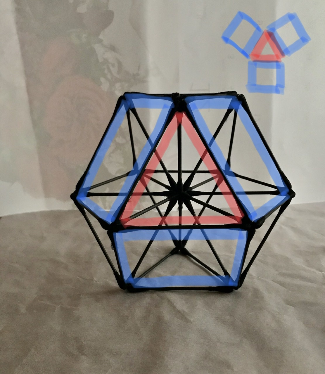 外側の形に注目すると、四角形の辺の隣には三角形が必ずきます。四角と四角の辺は隣り合うことはなく、三角と三角の辺も隣り合うことはありません。これで完成です!